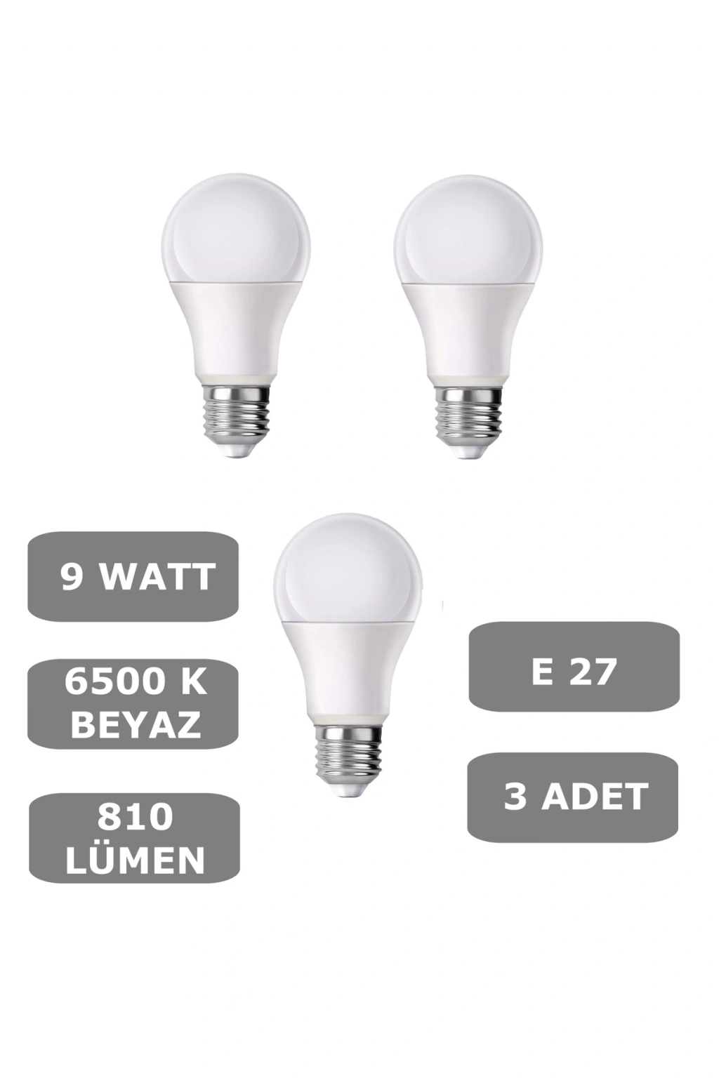 - 9 watt enerji tüketimiyle ekonomik aydınlatma sağlar, elektrik faturalarında tasarruf etmenize yardımcı olur.; - 6500K beyaz ışık renk sıcaklığı ile mekanlarınızı aydınlık ve ferah tutar.; - 810 lümen parlaklık seviyesi sayesinde geniş alanları etkin bir şekilde aydınlatır.; - Enerji sınıf aralığında yer almasıyla çevre dostu bir seçimdir; A'dan G'ye kadar olan enerji verimliliği skalasında yer alır.; - Beyaz ışık özelliği ile modern ve şık dekorasyonların vazgeçilmez parçasıdır.; - Üretici ülkesi Türkiye'den gelen bu ampuller yerel kaynaklı malzemelerle üretilmiştir.; - Standart E27 duy tipine sahip olması sayesinde geniş uyumluluk gösterir ve kolay montaj imkanı tanır.; - Toplamda üç adet olarak sunulan bu LED ampuller, birden fazla ihtiyaç için idealdir.