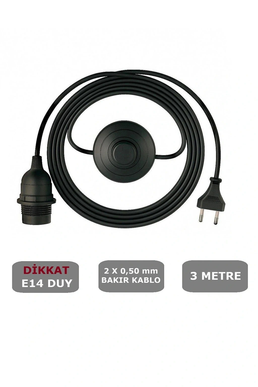 - 3 metre uzunluğundaki yerpuarlı yapısı ile geniş alanlarda kullanım kolaylığı sağlar.; - E14 duylu tasarımı, e14 ampullerle uyumlu çalışarak geniş bir ampul yelpazesi sunar.; - Açma-kapama anahtarı sayesinde ışığı kolayca kontrol edebilir, enerji tasarrufu yapabilirsiniz.; - 2x0,50 kalınlığındaki kablo kesiti, güvenli ve dayanıklı bir bağlantı sağlar.; - Siyah renk seçeneği ile modern ve şık bir görünüm kazandırırken, her türlü dekorasyona uyum sağlar.; - TR menşei garantisiyle yerli üretim kalitesini ve güvenilirliğini hissettirir.;