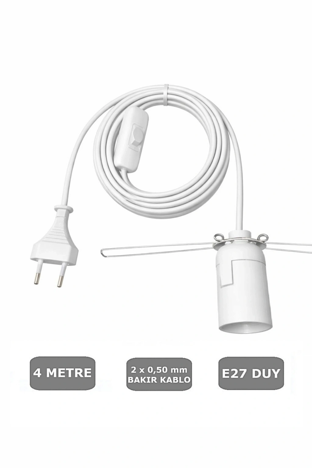 - Türkiye'de üretilmiş olup, yerel üretim avantajlarıyla öne çıkar.; - E27 duy tipi sayesinde geniş bir ampul yelpazesi ile uyumluluk gösterir.; - 4 metre uzunluğundaki seyyar kablosu, farklı alanlarda kullanım kolaylığı sağlar.; - Aç-kapat anahtarı ile pratik bir kullanım sunar ve ışık kontrolü sağlar.; - 65W'a kadar güç kapasitesiyle enerji verimliliği sunar ve aydınlatma ihtiyaçlarınıza cevap verir.;