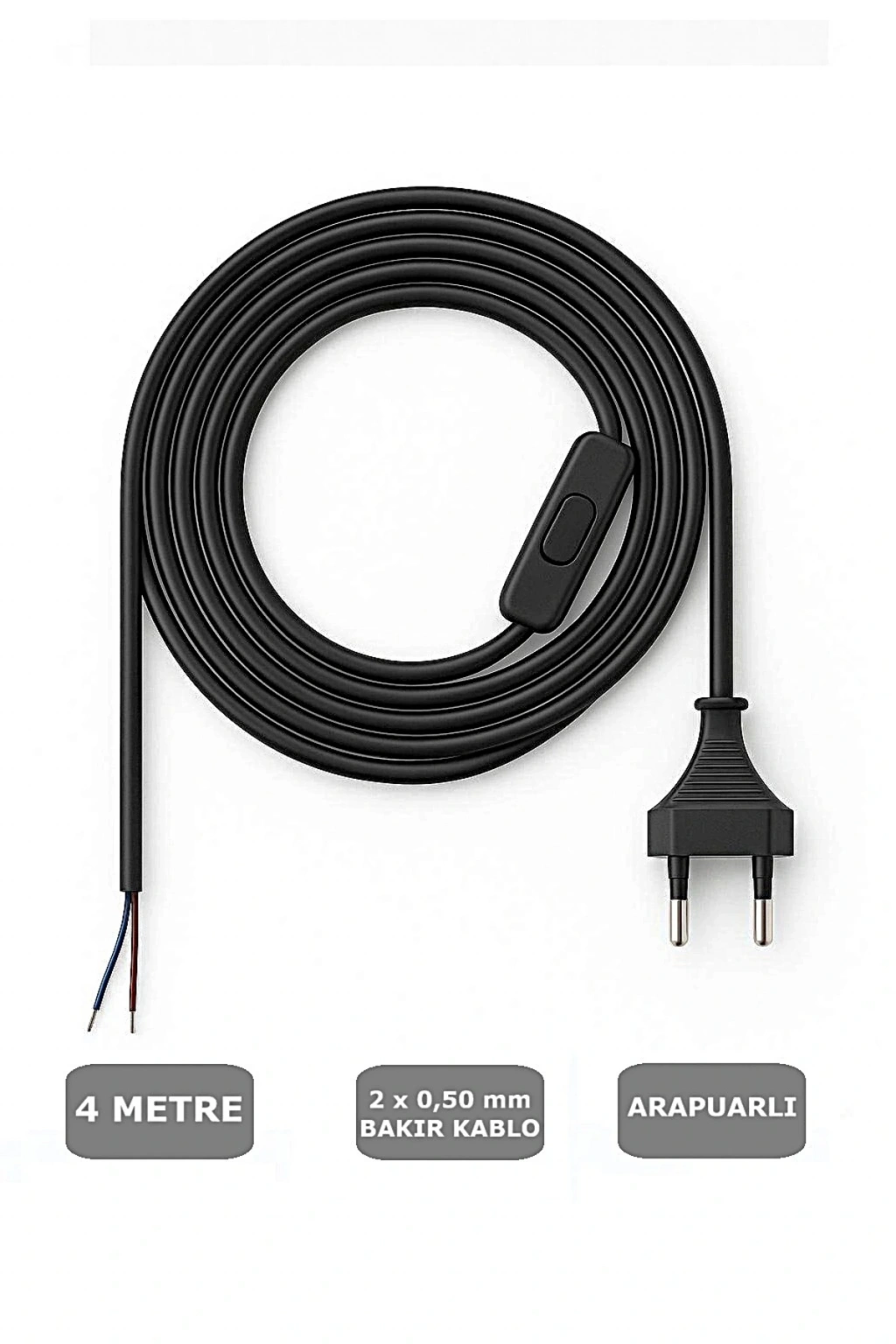 - Kolay kullanım için fişli arapuarlı kablo tasarımı.; - Dört metrelik uzunlukta, esnek ve pratik kullanım sunar.; - Siyah renk seçeneği ile dekorasyonunuza uyum sağlar.; - 0,50 mm² kalınlığındaki telleri sayesinde yüksek dayanıklılık ve güvenilir elektrik aktarımı.; - Anahtarlı yapısıyla enerji tasarrufu sağlar ve ekstra güvenlik sunar.